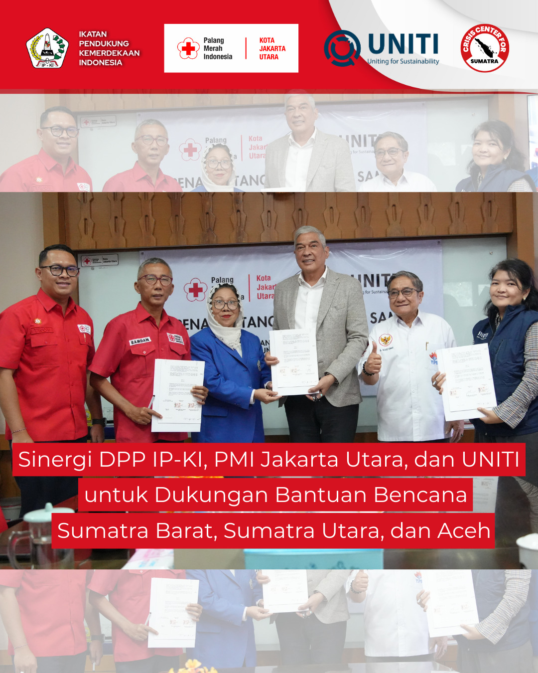 Pada acara yang diselenggarakan di Markas PMI Jakarta Utara dihadiri oleh Perwakilan PMI Jakarta Utara oleh Sekretaris PMI Jakarta Utara Ramdansyah Bakir menjelaskan bahwa kerjasama ini difokuskan pada penggalangan dana untuk membantu korban bencana di Sumatra Barat, Sumatra Utara dan Aceh. “Kami percaya dengan bergandengan tangan bersama DPP IP-KI dan Uniti For                          Sustainable, distribusi logistik dapat dipercepat dan bantuan bisa tersalurkan tepat sasaran,” ujar Ramdan Bakir.